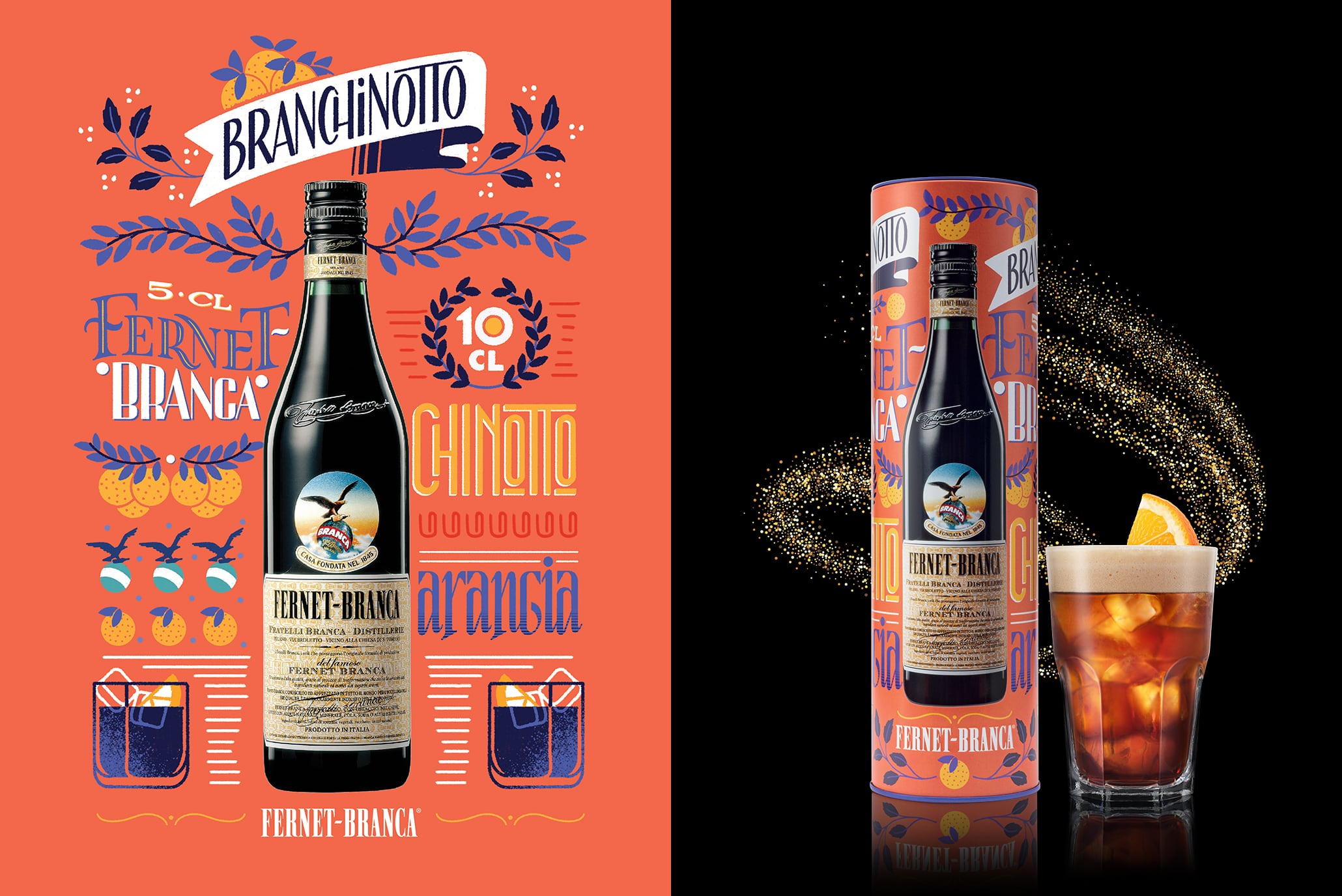 La bellissima latta arancione raccoglie in grafica gli ingredienti e la ricetta del BranChinotto, il cocktail nato dall’unione tra Fernet-Branca e il chinotto. Una ricetta semplice, piacevole per tutti i palati in cerca di un cocktail dissetante.