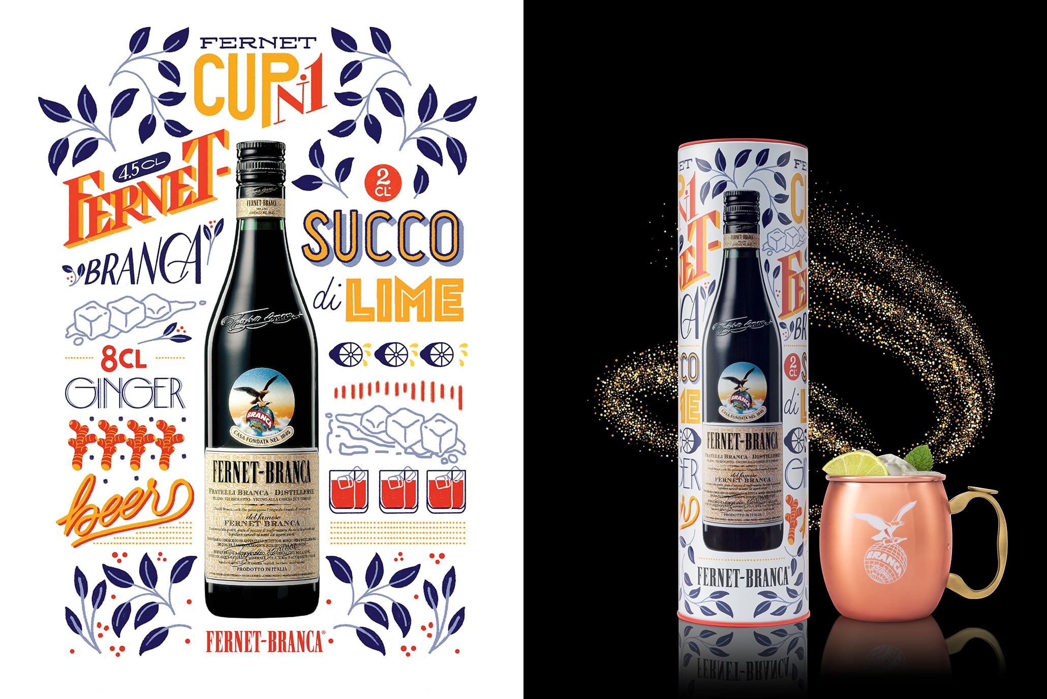 Sulla latta bianca dell’edizione limitata 2019 le illustrazioni descrivono dosi e ingredienti del Fernet Cup n°1. Il cocktail fresco e speziato dove limone e ginger beer esaltano il gusto unico di Fernet-Branca, ha il sapore delle feste.